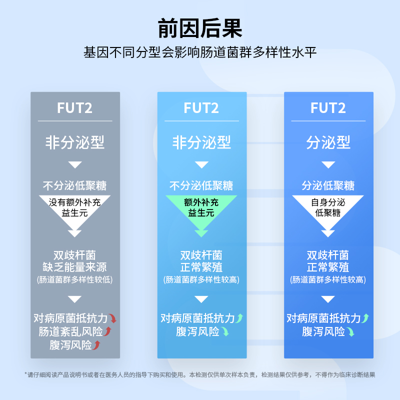 1、FUT2 基因的不同分泌型,会影响体内的双歧杆菌能否正常繁殖,提示是否需要及时补充益生元来提升抵抗力;2、APOA5 基因会影响双歧杆菌在肠道的丰度水平,我们可以依据不同的分型补充益生菌,从而降低MetS的风险。